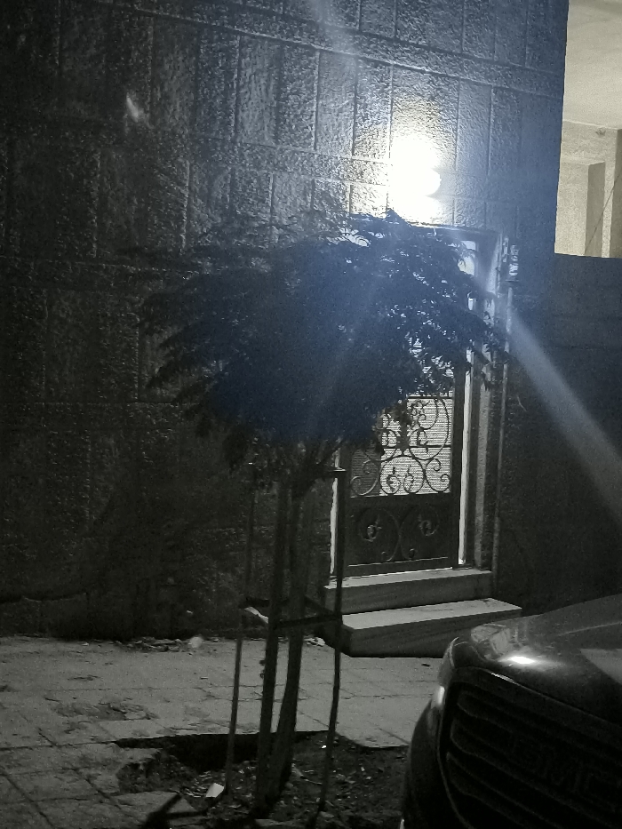 A dark, grainy night shot reveals a tree obscuring a door. The door is adorned with decorative metalwork and sits atop a short set of steps. A building wall, textured and dark, rises behind the door. A bright light illuminates the scene, casting a glow around the door and tree. Part of a vehicle, likely a car, is visible in the lower right corner of the frame.