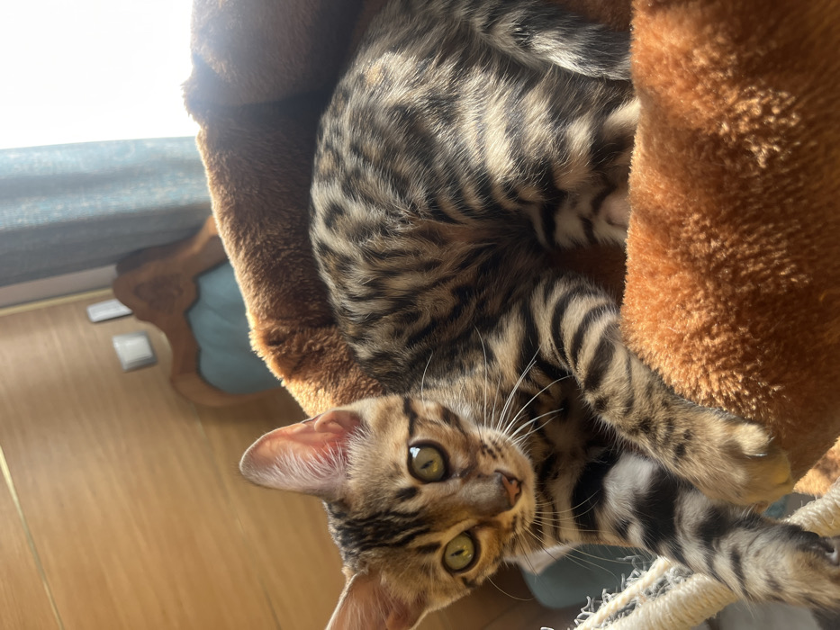 - "This image depicts a Bengal cat resting within a brown, plush pet bed or cat tree structure, likely indoors in Krushare, Bulgaria" by FM-LxPoh1, licensed under CC BY 4.0