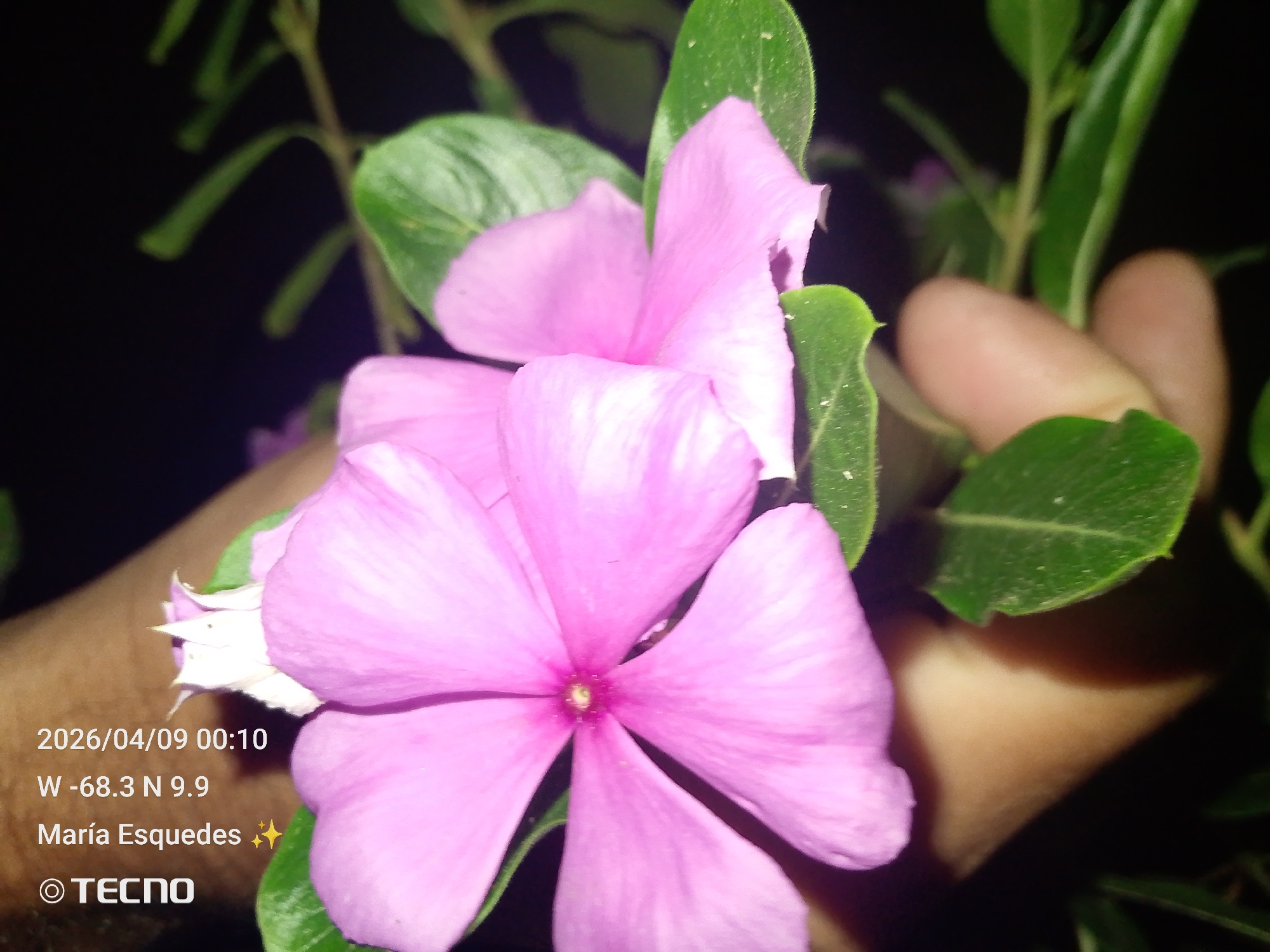 On 2026/04/09 at 00:10, a person, identified as Maria Esquedas, photographed pink flowers with green leaves. The photograph was taken using a Tecno camera at a location with coordinates W -68.3 N 9.9, placing it in Tinaquillo, Venezuela. The flowers are held by a human hand. The environment appears to be outdoors at night.