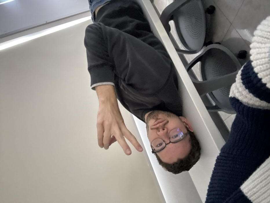 A man with dark hair and glasses is seen upside down. He wears a black sweatshirt and jeans. His hand is raised in a peace sign. Grey chairs with wheels are behind him. A white wall is to his left, while a person wearing a blue and white striped garment is partially visible to his right. The floor appears to be tiled.
