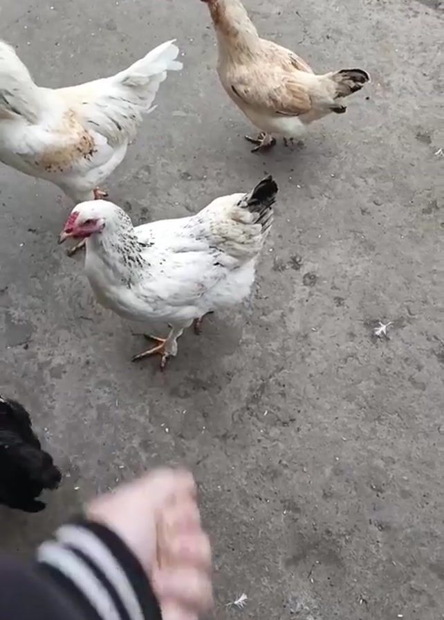 A hand reaches into the frame and scatters feed on a concrete surface. Several chickens of varying colors – white, brown, and black – gather and peck at the feed. More chickens appear as the feed is scattered. Feathers are scattered on the concrete. The scene appears to be outdoors. The hand belongs to someone wearing a dark jacket with white stripes on the cuff.