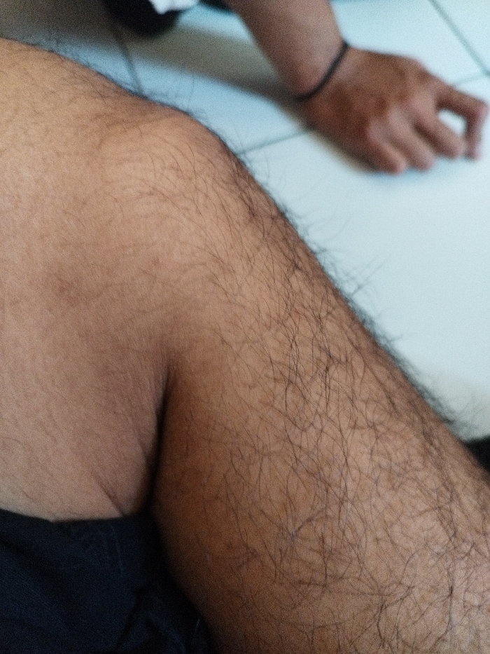 - "The image presents a close-up view of a human upper leg, characterized by medium brown skin and a dense covering of dark, fine hair" by FM-Z5SHs1, licensed under CC BY 4.0