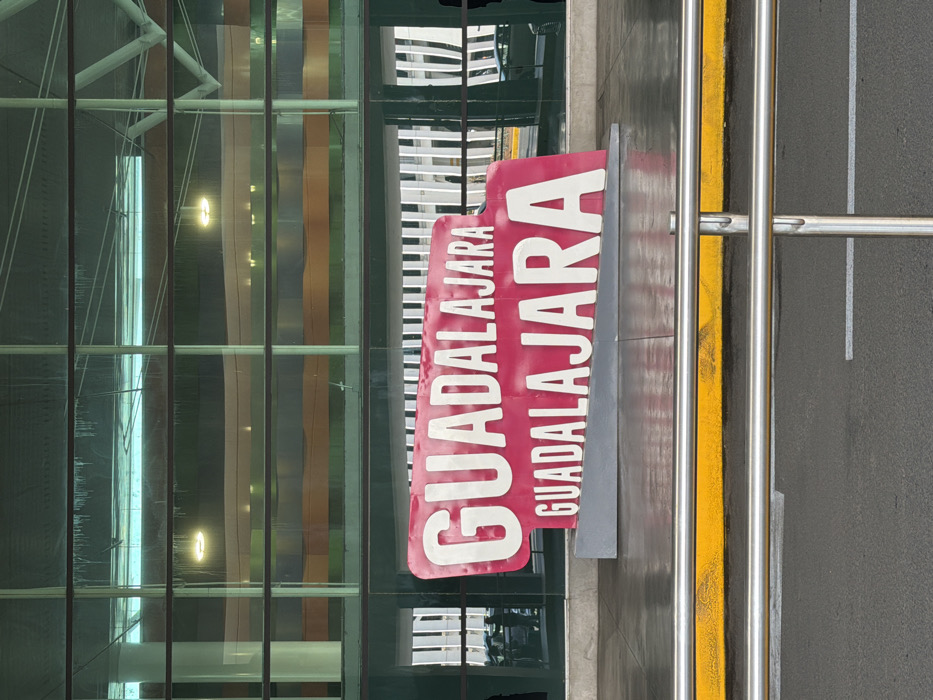 A sign displays "GUADALAJARA" in bold white letters on a red background, repeated in smaller font below