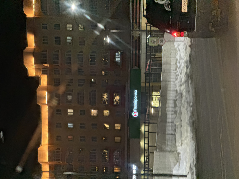 An outdoor shot captures a dimly lit urban scene at night. On the left is a multi-story building with many illuminated windows and decorative lighting. In the center is a green sign for a grocery store with Russian script. A snow-covered area and dark pavement are to the right. A vehicle is partially visible in the upper right corner. A street light casts glare near the top of the frame.
