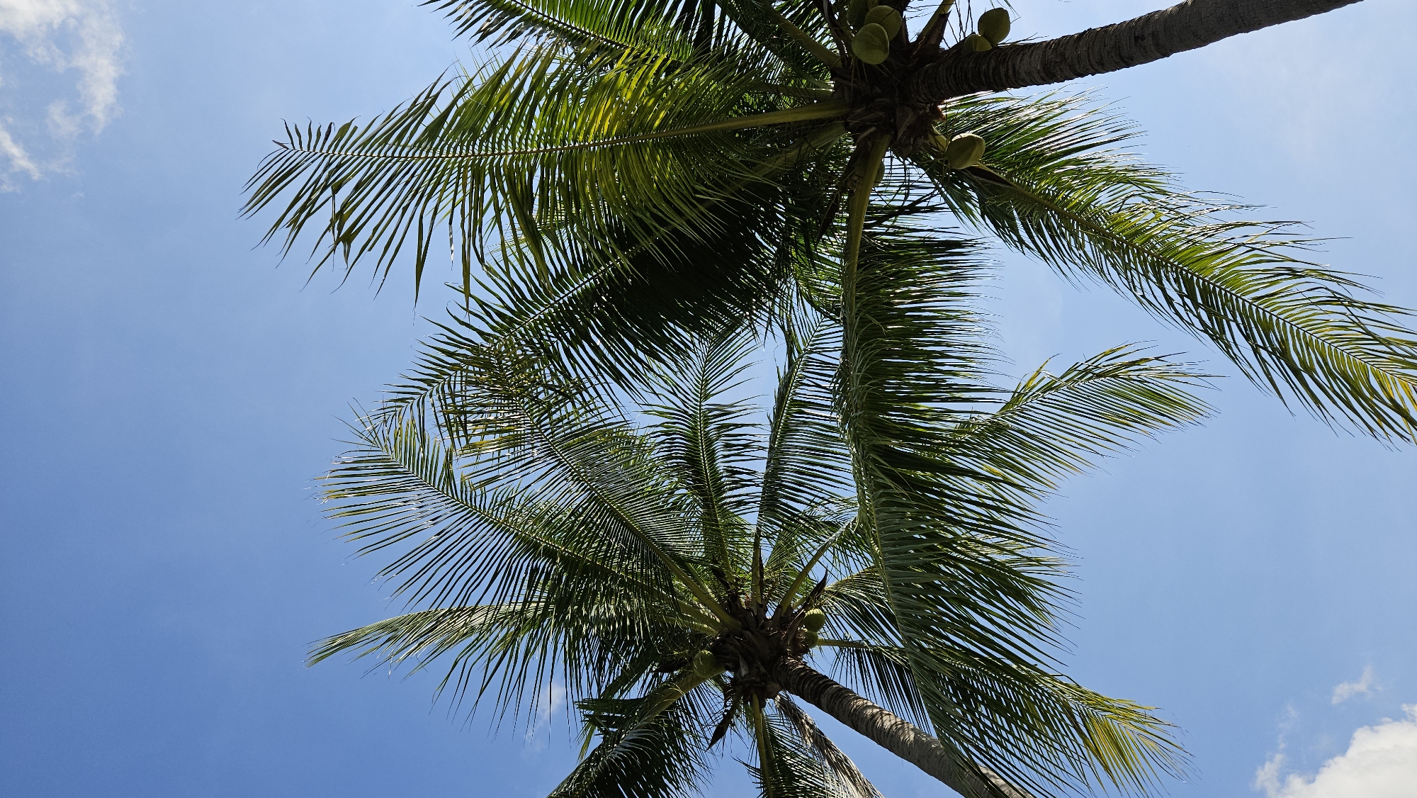 - "view looking up at two coconut palm trees against a bright blue sky with scattered, small white clouds" by FM-usA1U2, licensed under CC BY 4.0