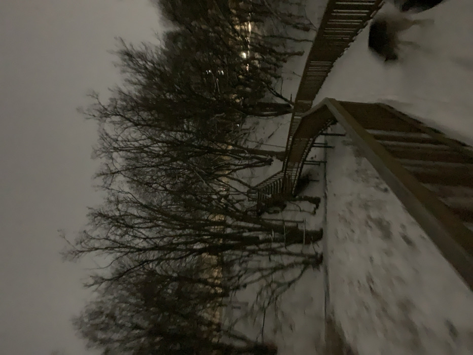 A snowy, bleak outdoor scene. Bare trees are silhouetted against a gray sky. A wooden walkway with railings meanders through the trees, elevated above the ground. Snow covers the ground, and the overall lighting is dim. The walkway appears to be a path or trail constructed through the trees, offering a unique perspective of the winter landscape.
