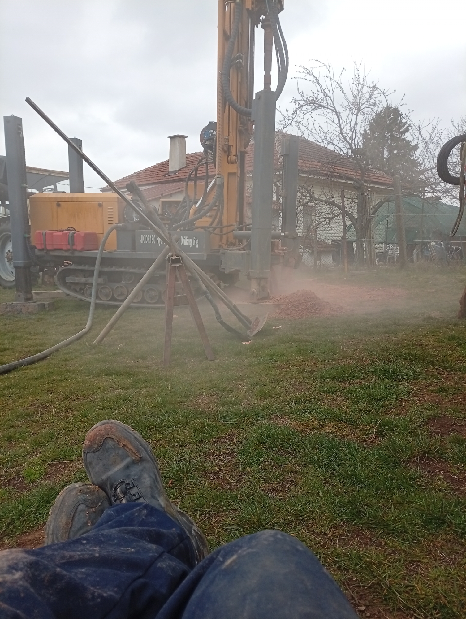 The image captures an active drilling operation in a residential or semi-urban setting, likely on the periphery of Sofia, Bulgaria. In the immediate foreground, the lower legs and feet of an individual are visible, wearing muddy dark blue trousers and dark, heavily soiled work boots, positioned over green grass with patches of exposed earth. The central focus is a yellow and gray tracked drilling rig, marked with "JK-DR180 Hy... Drilling Rig." The rig is actively boring into the ground, generating a visible plume of reddish-brown dust and excavated soil, which accumulates into a small mound. Several hoses extend from the machinery, and a metal tripod structure stands near the drilling point. Two red jerry cans are visible on the rig's side. In the background, a house with a distinct terracotta tiled roof and a chimney is partially visible. Bare-branched deciduous trees and a taller evergreen tree stand beyond the drilling area, with fencing also discernible. The sky above is overcast and uniformly gray.