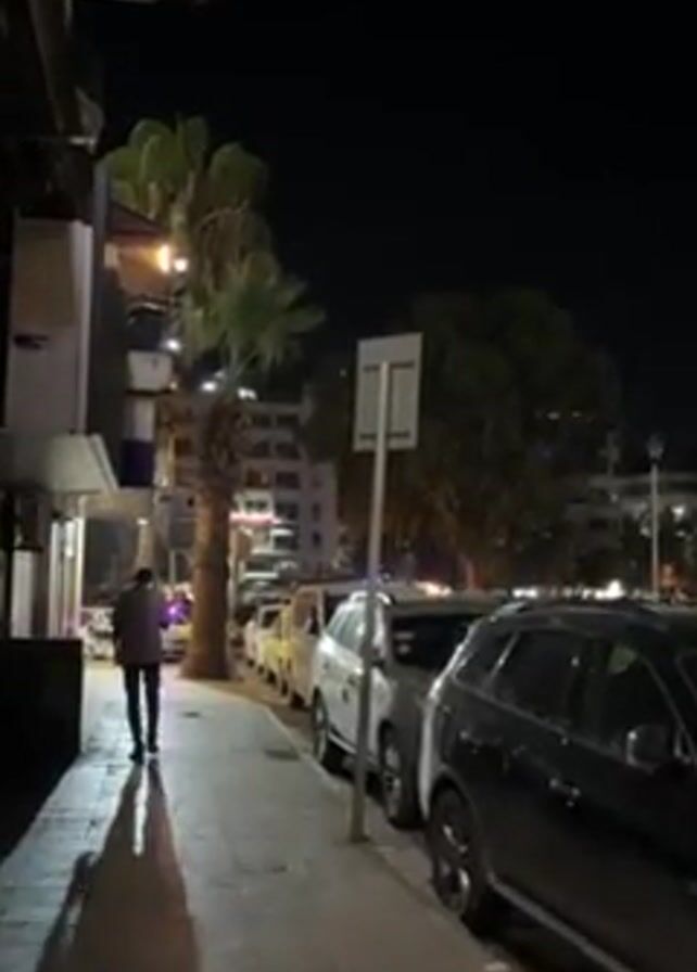 nighttime street scene. A person walks along a sidewalk beside a building on the left. A row of parked cars lines the street on the right. A palm tree stands near the building, and another tree is visible in the distance. Street lights illuminate the scene.
