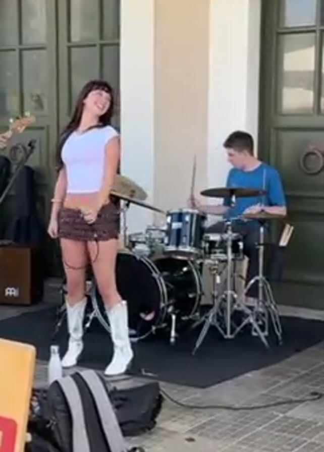 A young woman is singing on an outdoor stage with a band behind her. She has long dark hair with bangs, a white top, a short leopard-print skirt, and white cowboy boots. She is holding a microphone. Behind her, a young man is playing the drums. To the left of the stage, a bass guitar and cajón are visible. In front of the stage, a backpack is sitting on top of an amplifier. The stage is set up in front of a building with dark green doors and white columns. A young child can be seen standing in the foreground, facing the band.