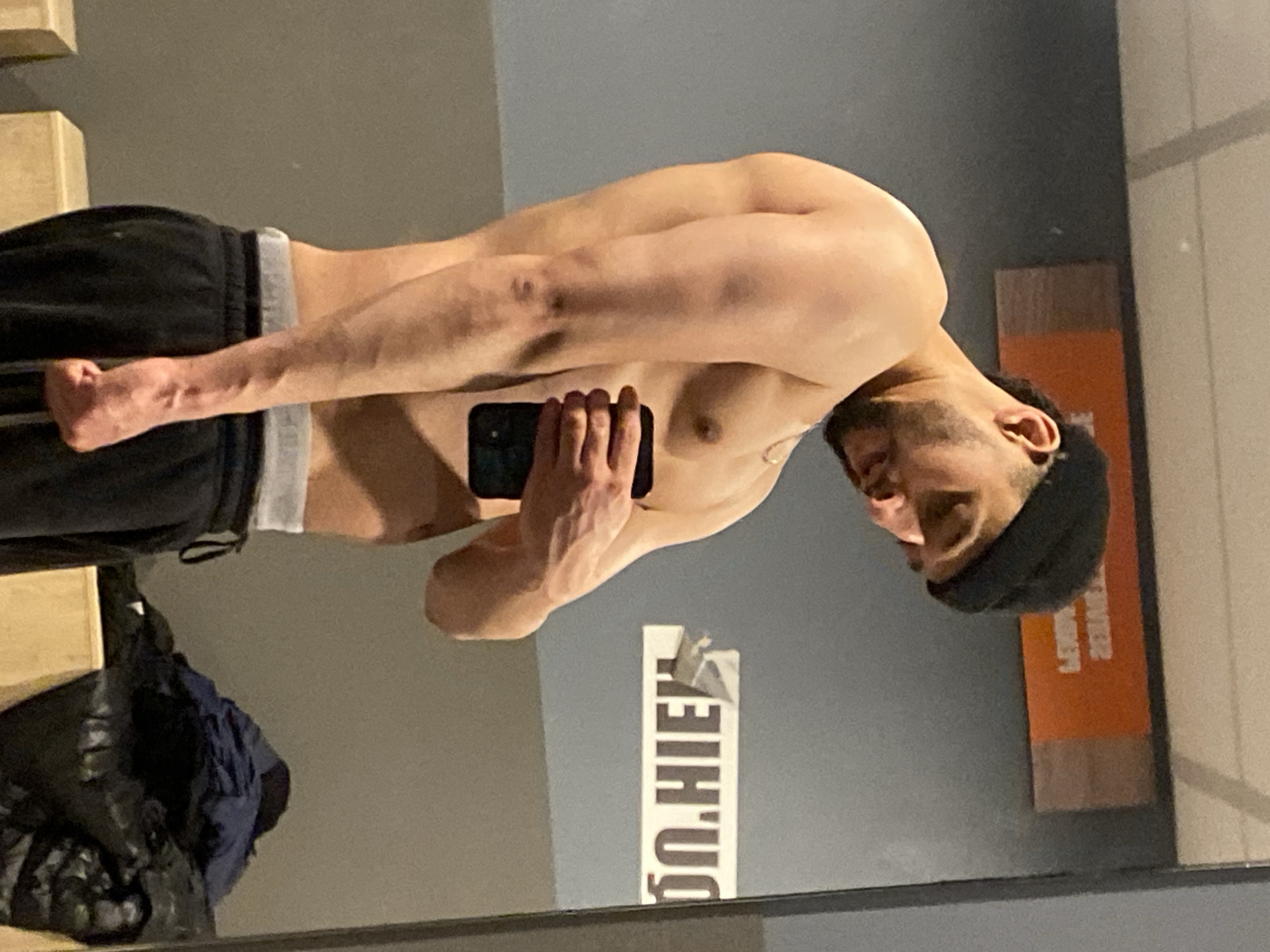 A shirtless man in Hœnheim, France, wearing a black beanie and black sweatpants, is taking a selfie in front of a mirror