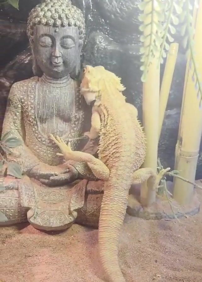 The video depicts a bearded dragon lizard clinging to a statue of Buddha inside an enclosure filled with sand-like substrate