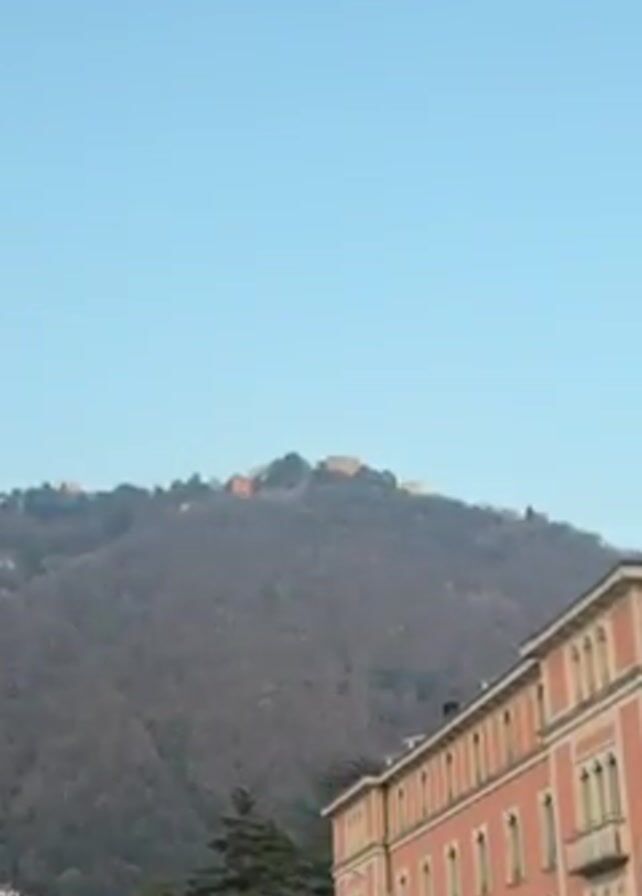view of a hill, on top of which sits a building of red and cream color with arched windows. The sky is blue. A building is on the right in the foreground. There is a street with traffic in the foreground also. The camera zooms in to provide a close-up of the building on top of the hill.