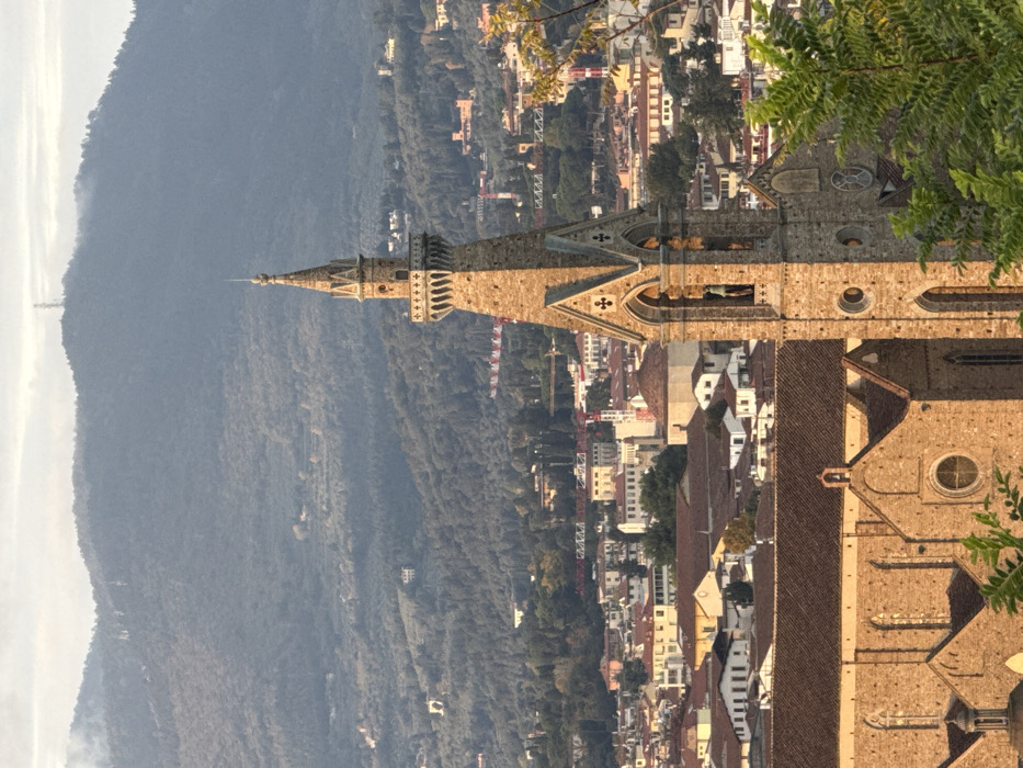 An elevated, long-range view captures the city of Florence, Italy, during golden hour lighting. The central subject is the Basilica di Santa Croce, prominent in the foreground. Its light-colored stone bell tower, featuring arched openings, Gothic tracery, and a spire topped with a finial, rises vertically, bathed in warm, direct sunlight on its left face. To the left of the tower, the basilica's nave and transept roofs are visible, constructed with terracotta tiles, alongside stone walls featuring round and arched windows. The midground reveals a dense urban landscape of Florence with numerous residential and commercial buildings characterized by terracotta-tiled roofs and light-colored facades. Several red and white construction cranes are visible above the rooftops. Beyond the city, densely forested hills rise, displaying varied topography. The farthest mountain peak in the background features a slender telecommunications tower. Atmospheric haze softens the distant hills. A tree branch with green foliage partially obscures the bottom right corner of the image. No people or discernible actions are visible. The scene is illuminated by the low angle of the sun, casting long shadows to the right of structures.