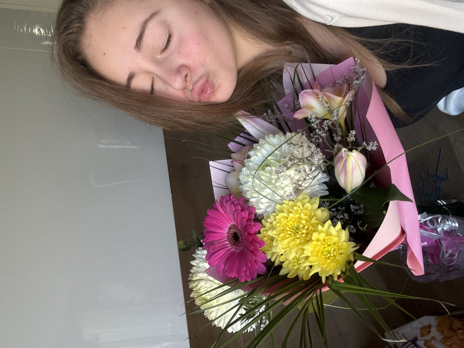 A young female subject, with long brown hair and wearing a black top beneath a light-colored outer garment, is positioned on the right side of the frame. Her eyes are closed, and her lips are pursed in a kissing gesture. She holds a large, vibrant floral bouquet wrapped in pink paper. The bouquet contains a central magenta gerbera daisy, multiple yellow and white chrysanthemum-like flowers, a light pink tulip, and light pink orchids, interspersed with green foliage and dried white floral elements. The background features a plain, light-colored wall above a dark brown surface. In the lower left, a portion of a clear plastic bag containing orange items and a purple object with ribbons are partially visible. The location of Kipra, Bulgaria, is not discernible from the visual evidence in the image.