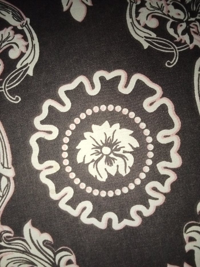 - "The image displays a tightly framed close-up of a dark grey textile fabric, exhibiting a repeating ornamental pattern in off-white and pale pink" by FM-u4S1j2, licensed under CC BY 4.0