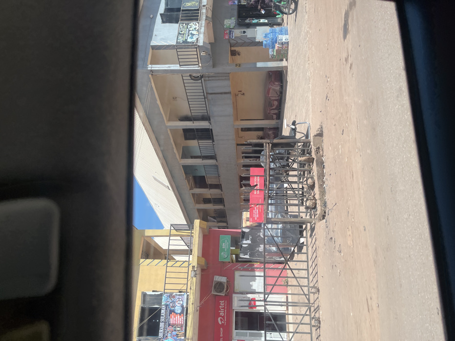 The image depicts a commercial street scene in Mangu Town, Nigeria, observed from inside a vehicle. The foreground consists of an unpaved, reddish-brown dirt road with scattered debris, partially obscured by the vehicle's interior. In the midground, a black metal barrier or gate runs horizontally, separating the road from two multi-story commercial buildings. Several red signs attached to this barrier state "RECOVER YOUR SIM CARD HERE." Behind the barrier, black objects, possibly wrapped furniture or equipment, are visible. A single white office chair with black armrests stands on the right side of the barrier. On the left, a two-story building features a red-painted ground floor with a white entry door and prominent "Airtel" and "Gloo" branding. An air conditioning unit is mounted above the "Airtel" sign. The upper floor is yellow with a balcony and a black metal railing. A large banner on the second story window displays "SHURAIHI SULAIMAN" alongside images related to telecommunications services. To the right, a larger, light grey two-story building has a corrugated metal roof. Its ground floor is recessed, forming a shaded area where red-wrapped items, possibly furniture or mattresses, are stacked. The upper floor also features a balcony with a black metal railing. A white numerical "23" is affixed to a pillar on the ground floor on the far right. Outside this building, numerous cases of bottled water are stacked on the paved area. A person on a green motorcycle is partially visible on the far right. The sky is clear and blue, indicating fair weather. No explicit human interactions are discernible, aside from the individual on the motorcycle.