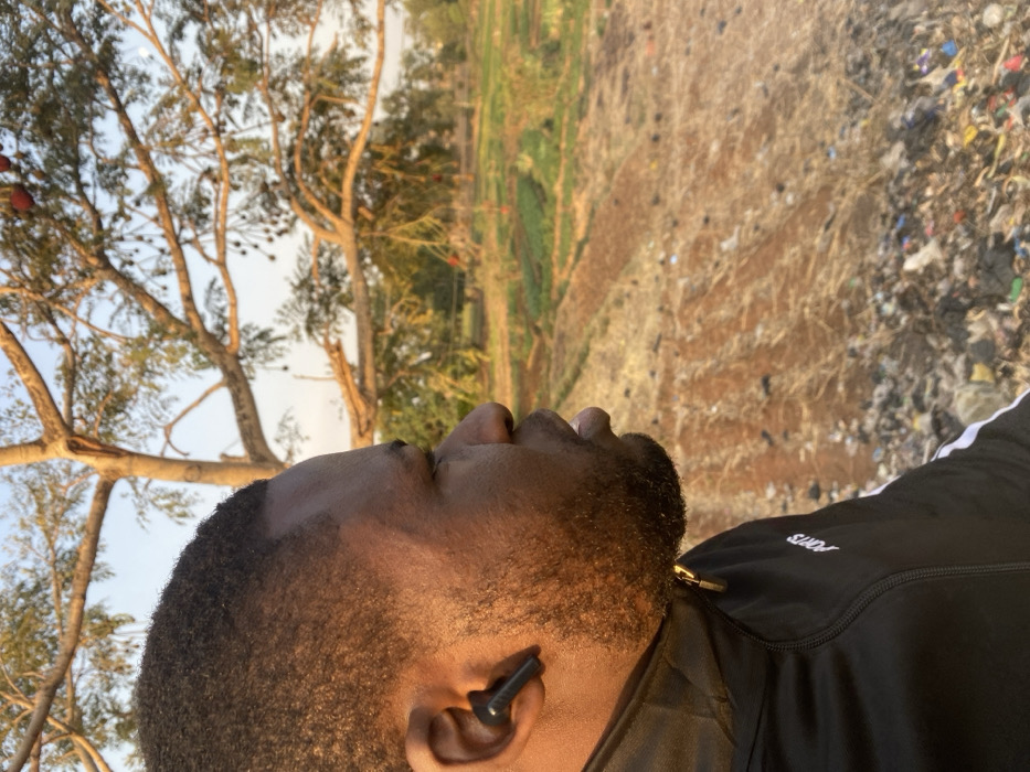 A dark-skinned man wearing a black and white athletic jacket is looking up. He is wearing a dark-colored wireless earbud in his ear. The background includes trees with sparse leaves, a field of varying vegetation, and what appears to be scattered debris. The lighting suggests it's either early morning or late afternoon.