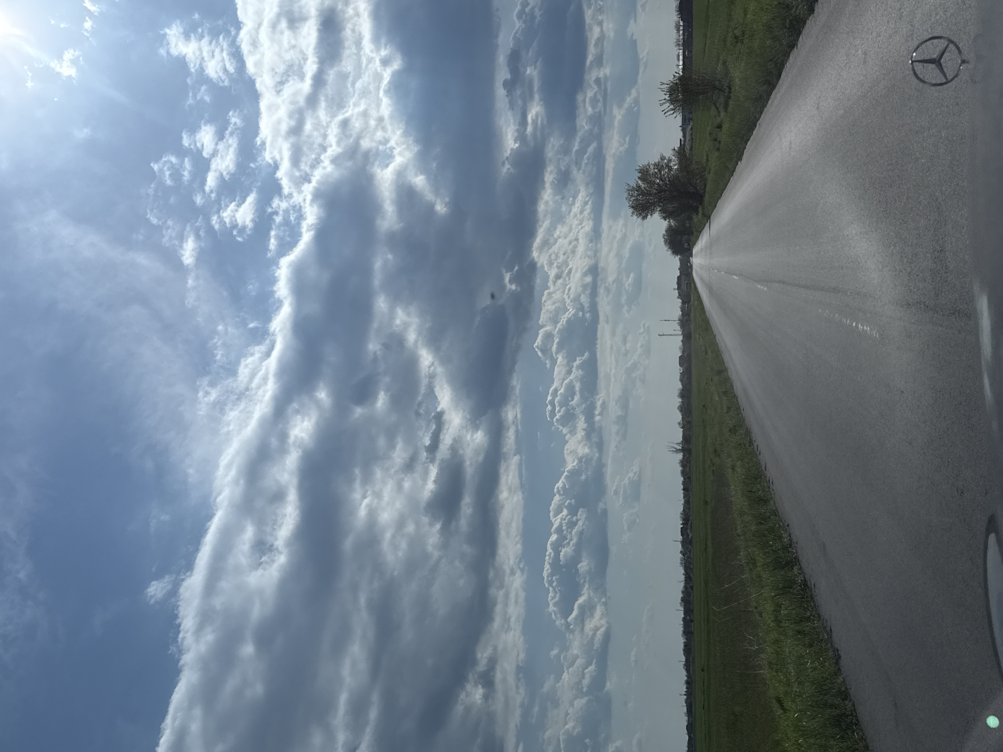 A rural road stretches straight ahead under a bright, partly cloudy sky