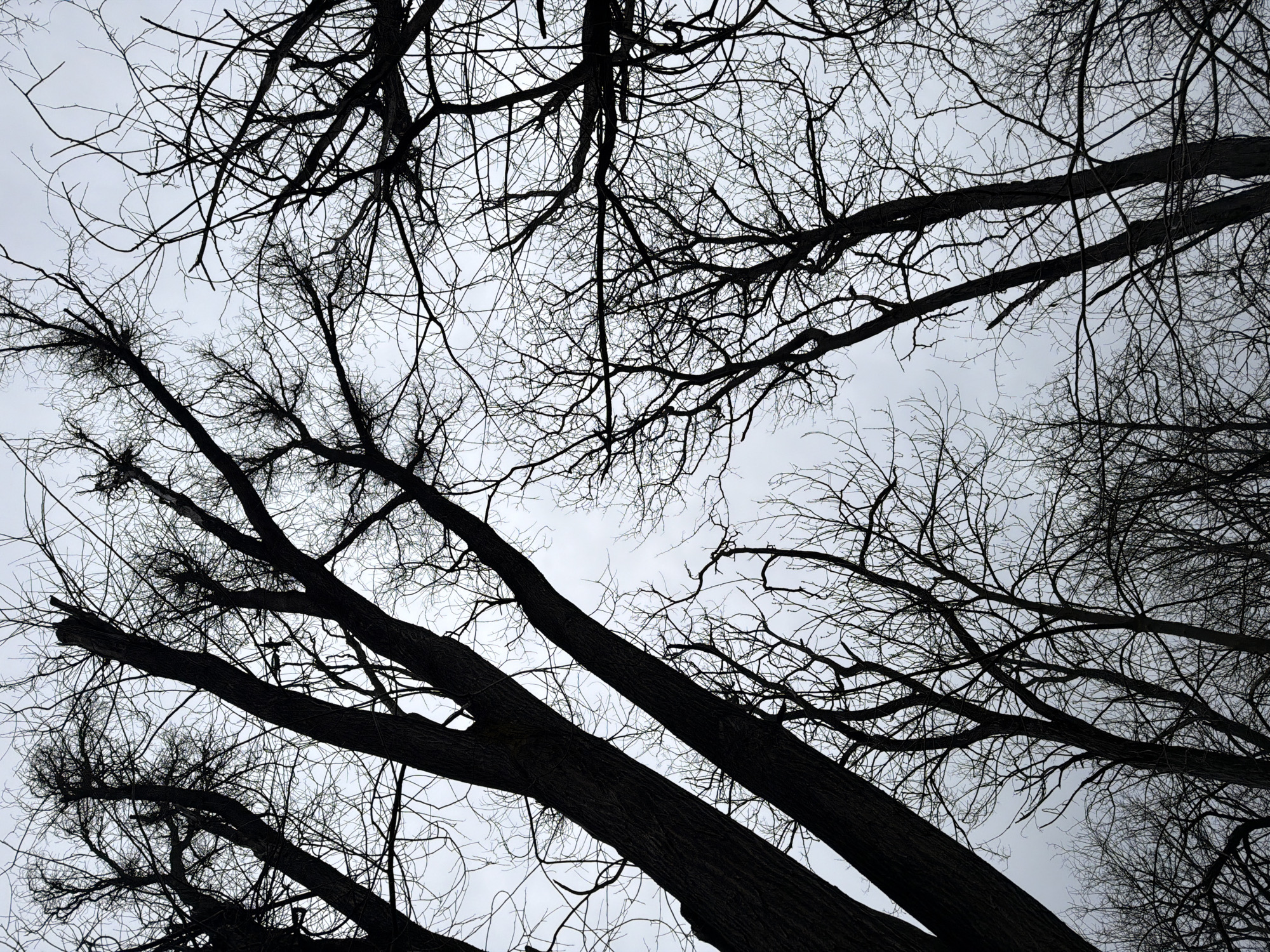 The image displays an upward perspective into the canopy of multiple deciduous trees, located in Razgrad, Bulgaria. The trees are in a dormant state, characterized by an absence of foliage, with their dark, textured trunks and intricate network of bare branches silhouetted against an overcast, uniformly light grey sky. Several prominent tree trunks are visible, extending diagonally from the lower-left and central portions of the frame towards the upper areas. A dense pattern of thinner, leafless branches fills the upper and peripheral sections of the image. No individuals, animals, or man-made objects are present. The illumination is diffuse, consistent with heavy cloud cover during daylight hours.