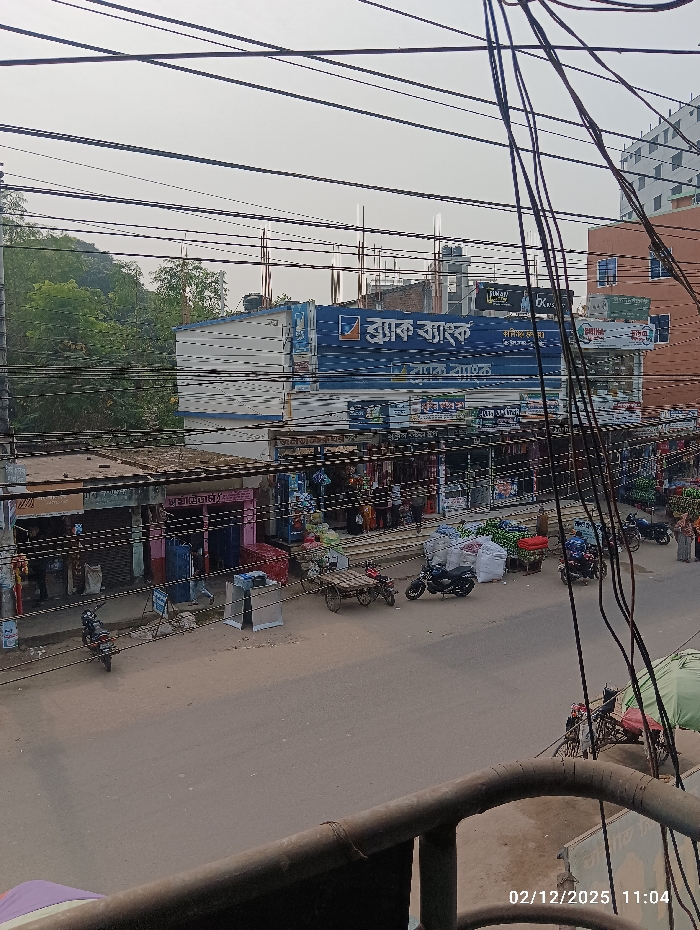 A street view shows a row of shops and businesses under a tangle of electrical wires. A prominent building with blue signage, "ব্র্যাক ব্যাংক" (BRAC Bank), stands out among the other structures. The street is filled with vehicles, including motorbikes and a cart. The scene is captured from a high angle, possibly from a building or balcony, with a railing visible in the foreground. Trees and buildings are visible in the background under an overcast sky.