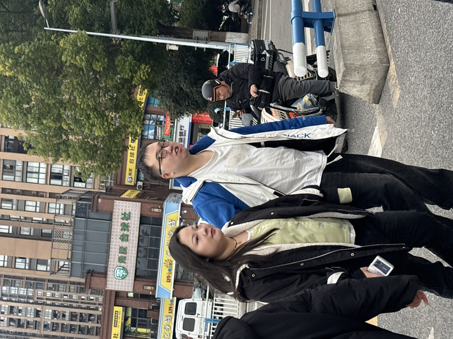 This image captures an urban street scene in a commercial area of Banan, China, featuring multi-story buildings and various street-level businesses, including a "Jiaodu Billiards Club." In the immediate foreground, from left to right, a partially visible individual in a dark coat holds a white smartphone. To their right, a woman in her late 20s to early 30s, with long dark hair, wears a black coat with a cream-colored fleece lining, a light green collared shirt, and dark pants, adorned with a thin gold-colored necklace. She looks slightly to her left. Next to her, a man of similar age, wearing eyeglasses, a blue and white zippered jacket over a white t-shirt, and dark pants with a light green rectangular patch on the upper left thigh, has his mouth slightly open and looks to his left. Both appear to be walking forward in a pedestrian zone. A concrete barrier with blue and white horizontal bars separates the pedestrian area from the roadway. Behind this barrier, in the midground, a man sits stationary on a light-colored scooter. He wears a dark helmet, a dark jacket, and grey pants, and is observed looking at a smartphone held in his left hand. Keys are visible in the scooter's ignition, and a black storage box is affixed to the rear of the vehicle. A white van is partially visible further down the street behind the barrier. The background consists of tall residential or commercial buildings. One prominent building displays a "角度台球社" (Jiaodu Billiards Club) sign with green and yellow lettering, along with other commercial signs, including one that reads "LYI-LYI". Large deciduous trees with green foliage and a street light pole are visible on the right side of the frame. The scene is illuminated by diffused natural light, consistent with an overcast day.