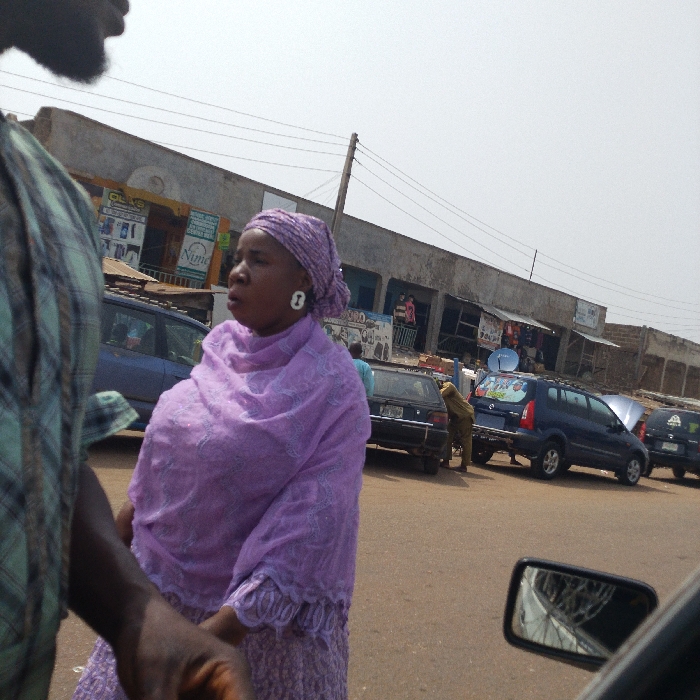 The image depicts a bustling street scene in Olomoda, Nigeria, under a bright, hazy sky