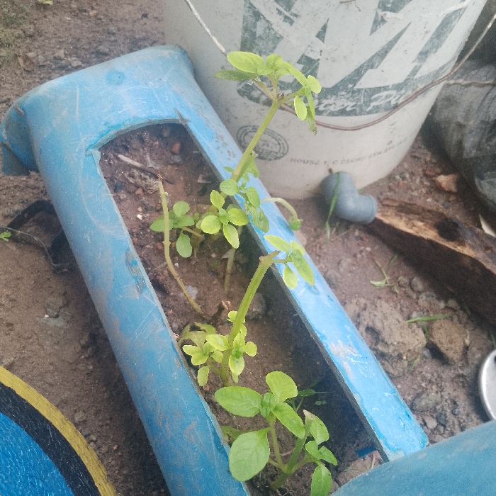 The scene depicts an outdoor setting in Madalla, Nigeria, viewed from a slightly elevated angle. The primary subject is a weathered blue PVC pipe, repurposed as a planter, positioned diagonally across the frame. The pipe has been cut lengthwise to form an open trough, which is filled with reddish-brown soil. Several young plants with small, light green leaves are growing within this planter, with multiple stems visible. The surrounding ground consists of dry, reddish-brown dirt. In the upper right background, a white plastic bucket displaying black text and graphics is partially visible. Adjacent to the bucket on the ground are a grey PVC elbow joint and a piece of wood. A segment of a yellow and black object is present in the lower left foreground. No individuals are depicted, and no specific actions or interactions are occurring.