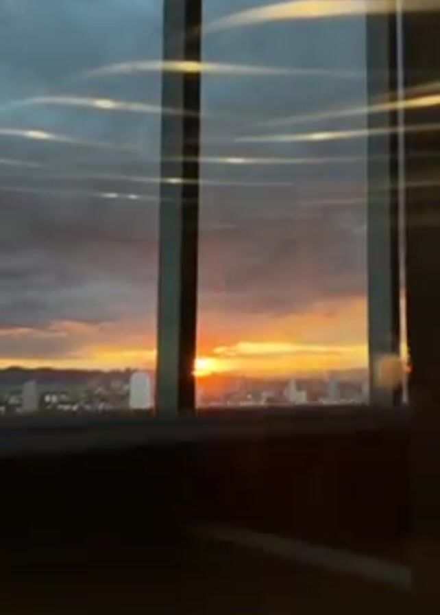 The video presents a static shot through a multi-pane window, revealing a sunset over a cityscape