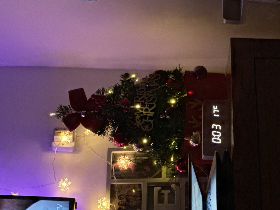 A decorated Christmas tree sits atop a shelf or cabinet against a white wall with purple lighting. The tree features a red bow, ornaments, and a "Merry Christmas" sign. String lights shaped like snowflakes are draped nearby, plugged into a wall outlet. A digital clock displays "0:03 17C". A portion of a television screen is visible at the bottom left, and a dark door or cabinet edge is on the right.