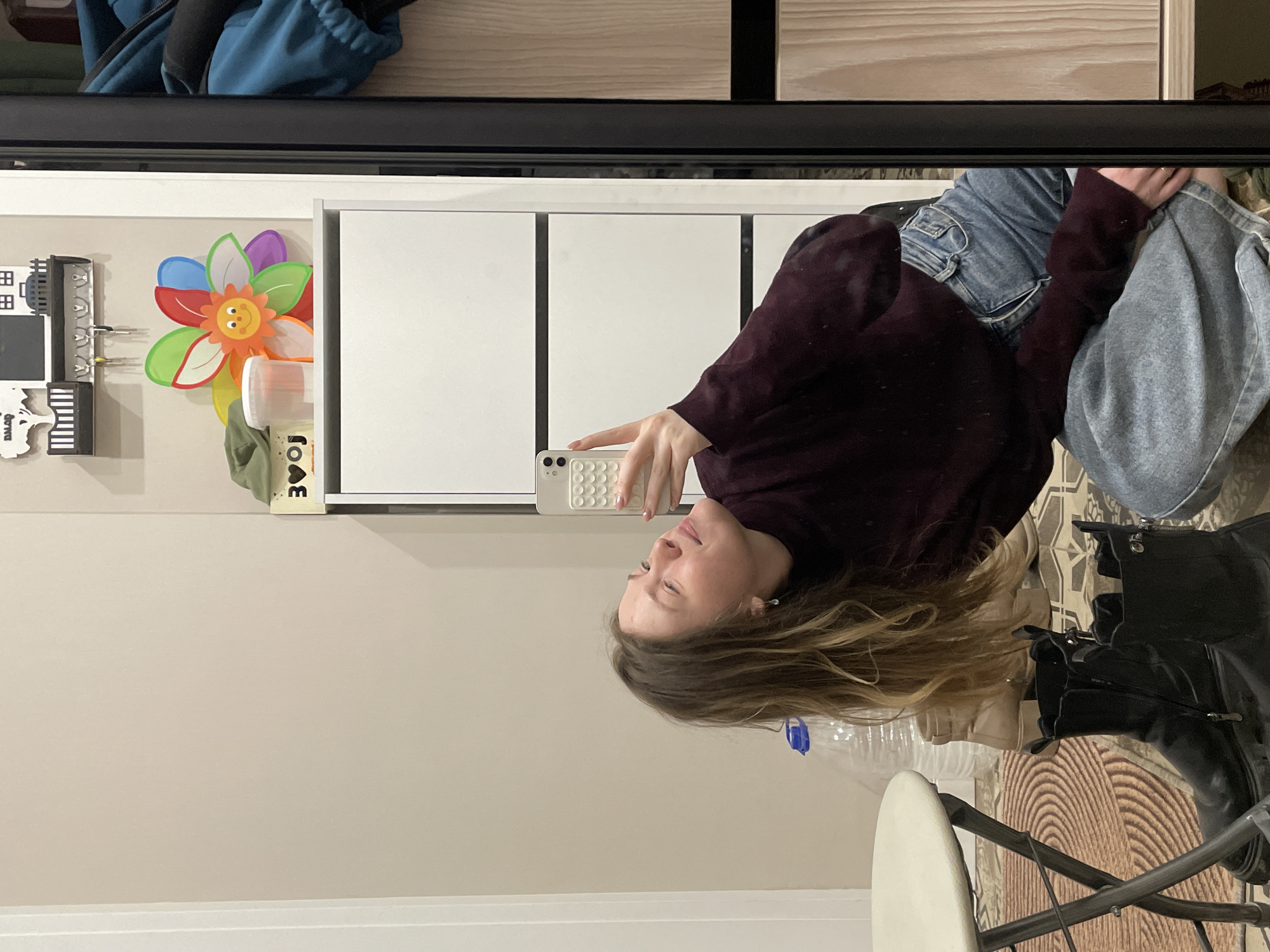 A mirror selfie taken indoors in Kommunarka, Russia shows a young, light-skinned woman with long blonde hair, wearing a maroon sweater and jeans, holding a white phone in her hand. The mirror reflects the upper half of her body. Behind her, a white storage unit is visible, with a colorful flower decoration and a small chalkboard hanging on the wall. A clear plastic water bottle and a black jacket are on the floor next to a chair with a white seat. The floor has a geometric pattern. Above the reflection, the top of a closet and the edge of a blue jacket are visible.