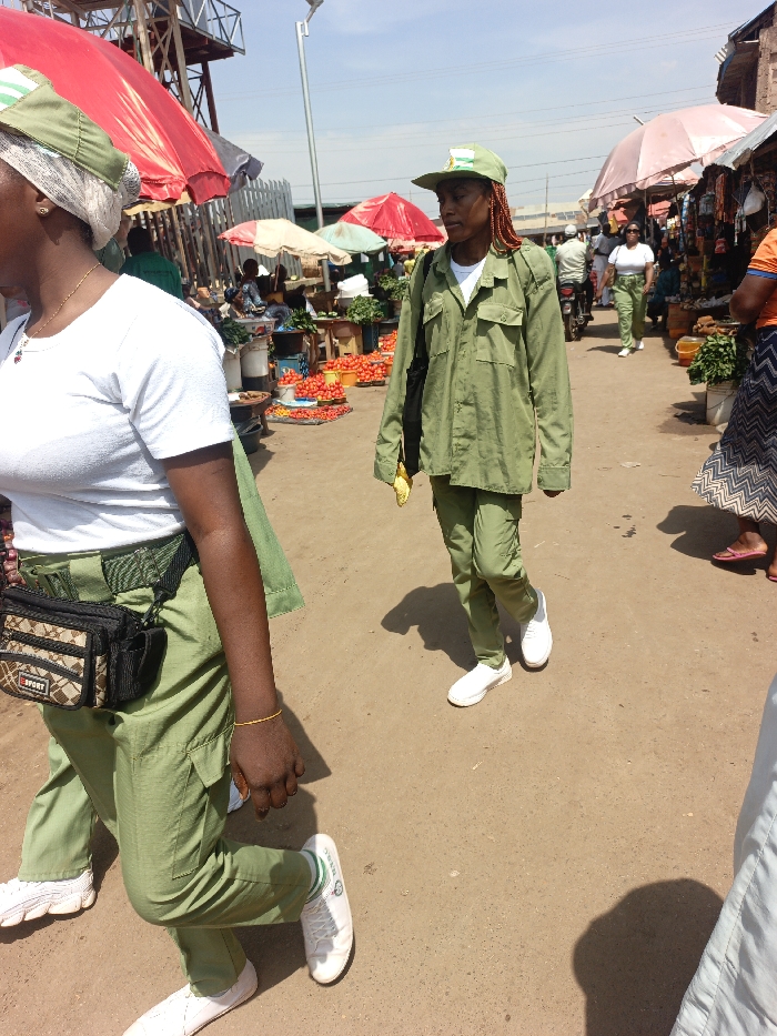 This image depicts a bustling outdoor market scene in Akwanga, Nigeria, under daylight conditions. The ground is unpaved, appearing as compacted dirt. In the immediate foreground, partially visible on the left, is a female individual walking rightward. She wears a white short-sleeved t-shirt, green trousers, and white sneakers. A camouflage-patterned waist bag, featuring "SPORT" text, is secured around her waist. A thin gold-colored bracelet is visible on her right wrist. Her head is adorned with a light-colored headwrap under a green cap with a white and green emblem. In the mid-ground, centered, another female individual walks rightward, fully visible. She wears a long-sleeved green uniform shirt over a white t-shirt, green trousers, and a matching green cap with a white and green emblem. Her hair is styled in reddish-brown braids. A black shoulder bag is carried on her left side, with a yellow object (possibly a fruit) attached to it. She wears white sneakers. Both foreground individuals are identifiable as members of the National Youth Service Corps (NYSC) by their attire. The background shows numerous market stalls lining both sides of the pathway. These stalls are shaded by various umbrellas, predominantly red and light-colored. Merchandise displayed includes large quantities of red tomatoes in buckets and on mats, as well as piles of green leafy vegetables. Several other individuals, appearing as vendors or shoppers, populate the market. One person in the distant background also wears a green uniform, and another individual is seated on a motorcycle. A tall utility pole with a street light extends upwards on the left side of the frame, with a metal-framed structure (possibly a water tower or telecommunications mast) visible behind it.