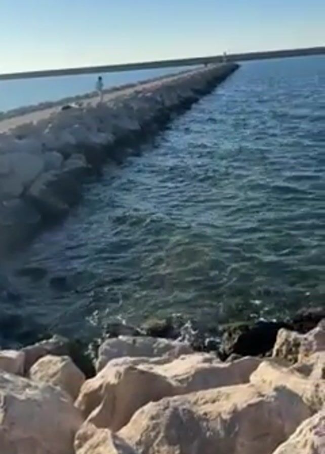 rocky shoreline with a long stone pier stretching out into a bay or inlet under a clear blue sky. At the end of the pier is a small lighthouse. A person is walking down the pier. The water is a deep blue with small waves lapping against the rocks. Across the bay, mountains rise in the distance. The camera pans from the pier to the open water and then to the mountains in the background.