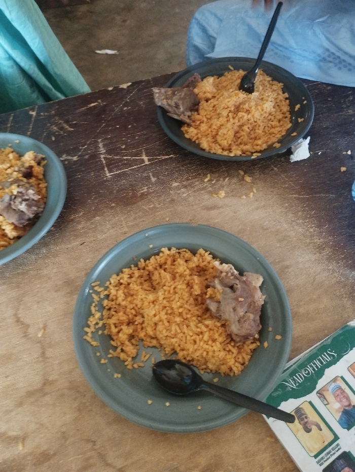 wooden table with two plates of rice and meat. The plates are both grey and have a small amount of rice left in them. There is a black plastic spoon in one of the plates, and a black plastic spoon on the table. The table is wooden and has scratches on it. The background shows a light blue cloth and a piece of green cloth, presumably on a chair or sofa. The photo was taken at a location in Kaltungo, Nigeria, with coordinates (latitude: 9.816, longitude: 11.314). A magazine is on the table to the right of the plates, visible only from the lower right edge. The cover of the magazine is green and includes the words “Head Officials” with several pictures of people on it. The pictures are bordered by white and the letters are gold.