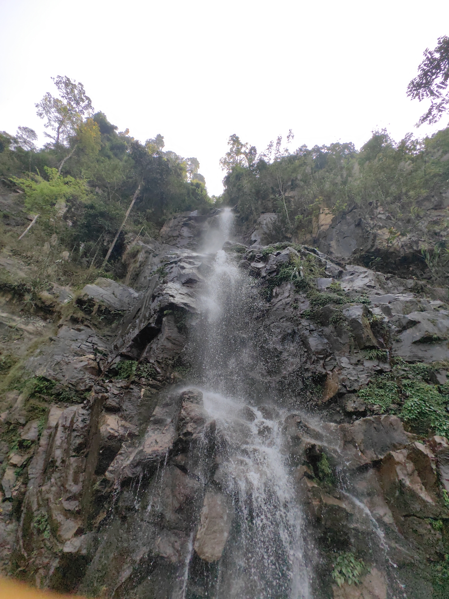 waterfall cascading down a rocky cliff face. The cliff is covered in vegetation, with trees and plants growing among the rocks. The sky is visible at the top of the frame, appearing overcast. The image was taken in Lùng Tám Commune, Vietnam.