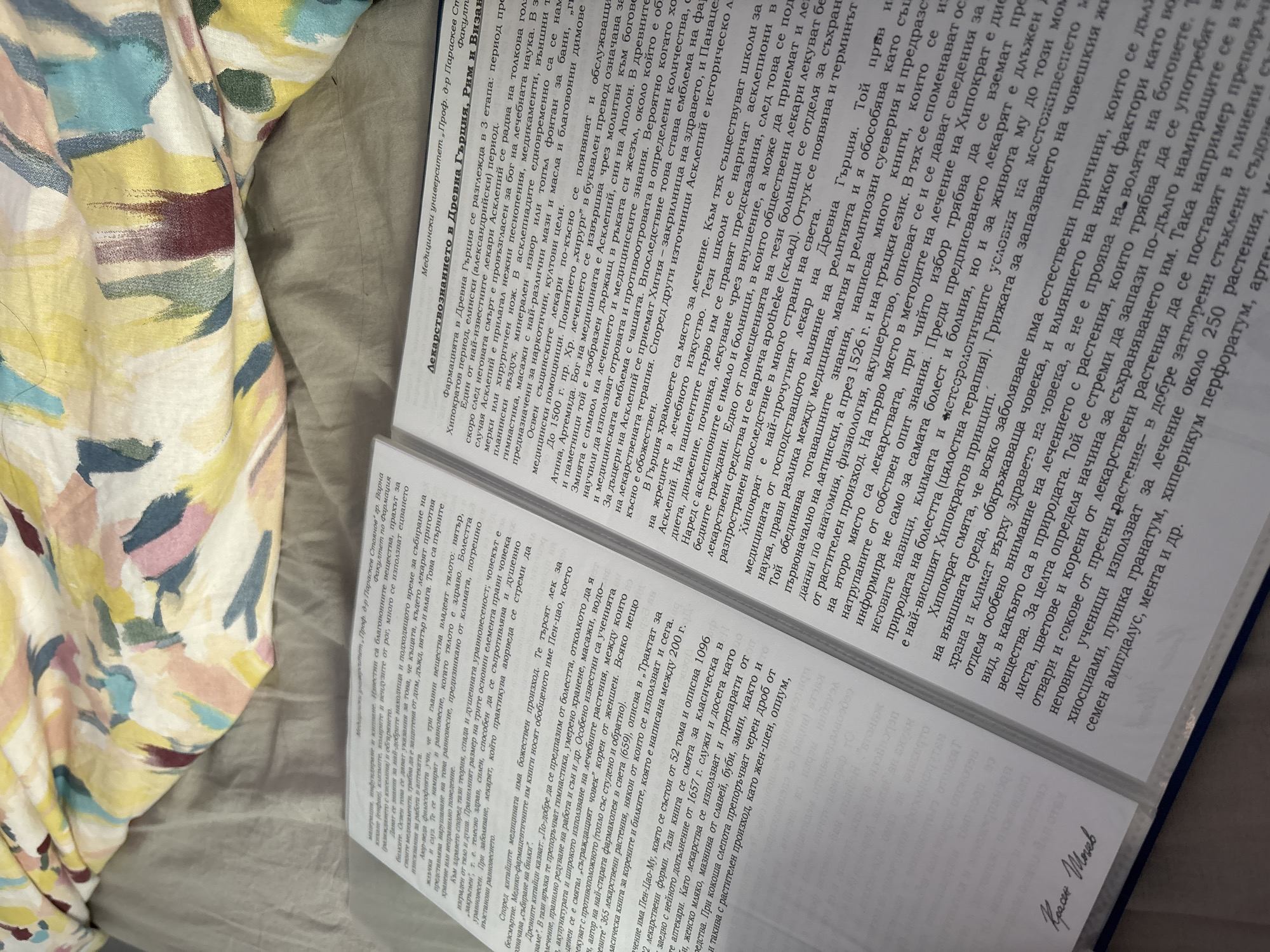 The image displays an open book, resting on a neutral gray fabric surface, partially covered by a multi-colored, abstractly patterned textile. The book features text in Bulgarian. The right-hand page shows headings related to "Medical University 'Prof. Dr. Paraskev Stoyanov' – Varna" and "Pharmacology in Ancient Greece, Rome, and Byzantium." A handwritten signature, "Красен Томов" (Krasen Tomov), is visible in cursive on the bottom left-hand page. The patterned textile exhibits brushstroke-like designs in shades of yellow, beige, light blue, pink, and dark red. No individuals are present. The scene is an indoor setting within the city of Sofia, Bulgaria; however, no specific landmarks or external environmental cues are discernable to pinpoint an exact location within Sofia.