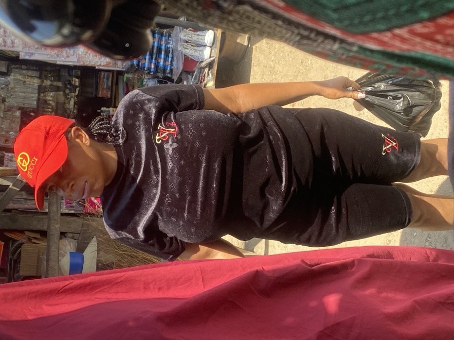 The image depicts an outdoor market scene in Lokoja, Nigeria. A female individual, approximately in her 30s-40s, stands in the center-left, facing slightly left and looking past the frame with a neutral expression. She wears a red baseball cap with a gold "Gucci" logo and a two-piece black velour outfit consisting of a short-sleeved top and matching shorts, both embroidered with a red and gold "LV" style monogram. Her right arm hangs at her side, holding a crumpled black plastic bag. Her fingernails on the visible right hand are painted white. To the immediate left, a large section of dark red fabric partially obscures the view. The background on the right reveals market stalls with merchandise, including rows of watches or small items displayed on shelves, and at least two pairs of white high-top sneakers on a lower shelf. Wooden structural elements of the stalls are visible, along with what appears to be a blue container behind the red fabric on the far left. The scene is illuminated by bright daylight, casting defined shadows. No other individuals are clearly visible, and no direct interactions are occurring within the frame.