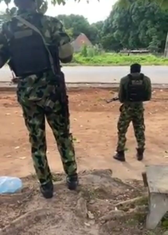 Two uniformed soldiers are standing in an outdoor setting. Both are wearing camouflage outfits and holding firearms. One soldier is closer to the camera and has his back to the viewer. The second soldier is standing further away, facing away from the camera, looking towards a road in the background. There are trees and greenery visible, and a building in the background.