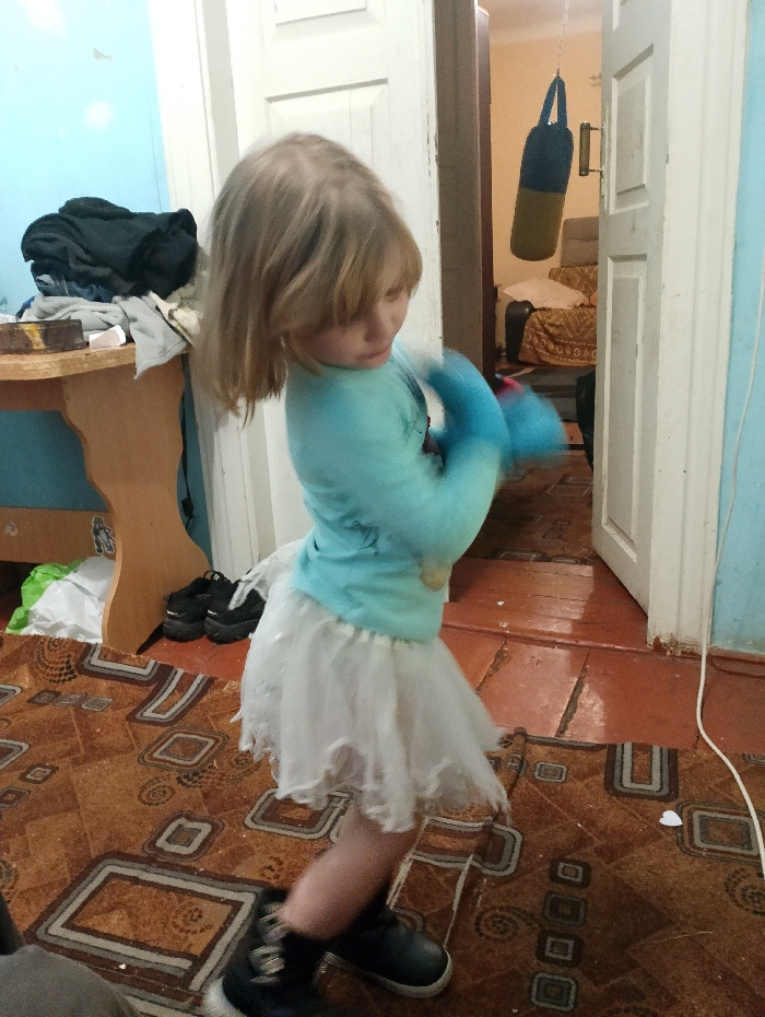 A young girl with blonde hair, wearing a light blue long-sleeved shirt and a white tulle skirt, appears to be playing. She wears dark boots. In the background, there's a partially visible room with a punching bag hanging from a door frame. There is furniture visible in the background and a patterned rug on the floor. Also visible is a table with items piled on top. The room has a somewhat cluttered and lived-in appearance.