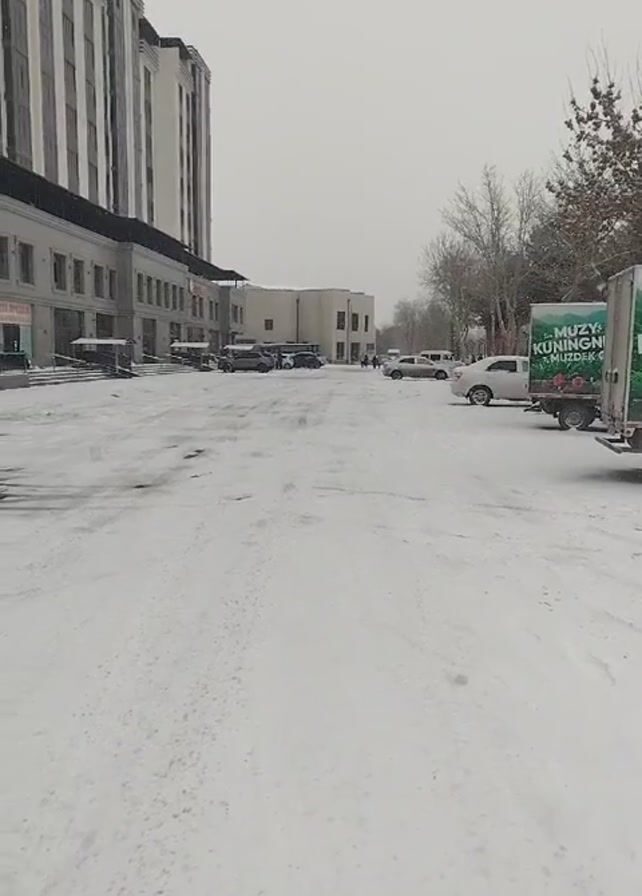 snow-covered parking lot in front of a tall building with a Globus supermarket on the ground floor