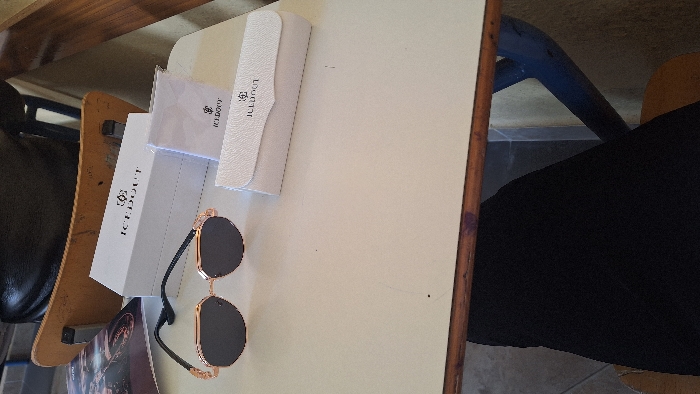 The scene depicts an indoor setting, likely in Ablanitsa, Bulgaria, viewed from a slightly elevated perspective. A white rectangular table or desk occupies the center of the frame. On the table, a pair of hexagonal-lensed sunglasses with rose gold-colored metal frames and black earpieces is positioned in the foreground. To the right of the sunglasses, a white box with "ICEDOUT" and a logo printed in black is present. Behind this box, a small white cloth or pouch with the "ICEDOUT" logo is partially visible. Further to the right, a white glasses case with a flap closure, also bearing the "ICEDOUT" logo, is situated. In the background, behind the table, a wooden skateboard deck with black trucks is visible, partially obscured by a dark object. Next to the skateboard, a magazine featuring an image of a motorcycle is open. Below the table, a dark-clothed human leg, bent at the knee, is visible. A dark blue metal chair leg is also discernible beneath the table. The floor and wall behind the table appear to be light in color.