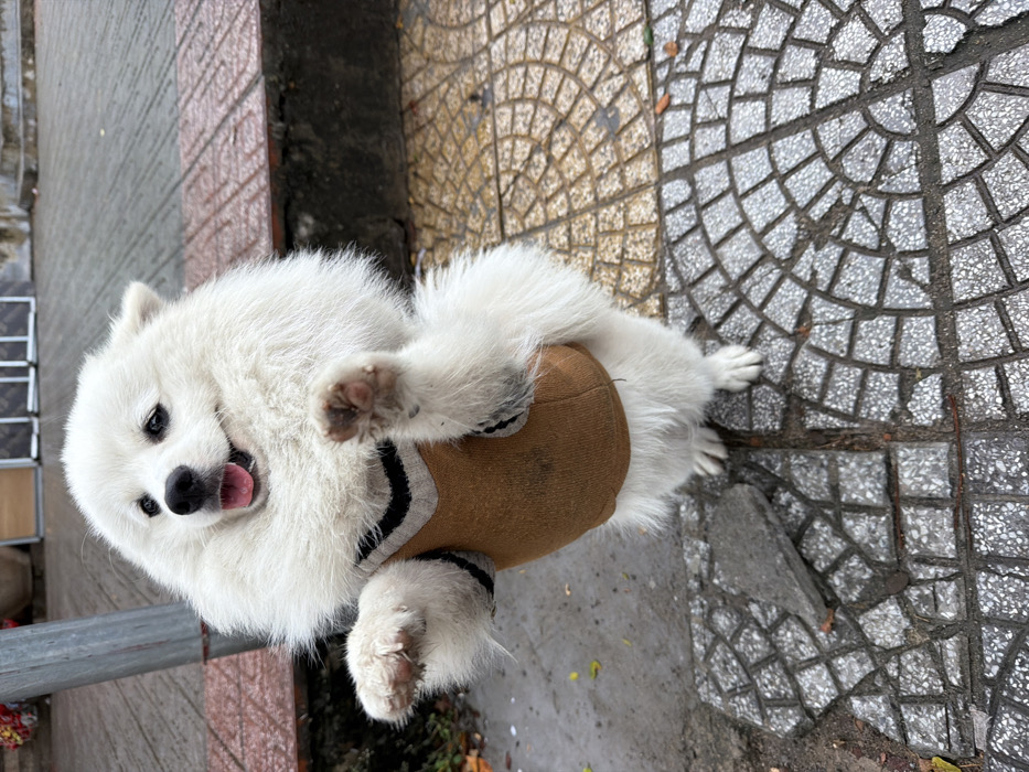 - "A white, fluffy dog, consistent with a Samoyed breed, stands upright on its hind legs on a paved sidewalk in An Hải Ward, Vietnam" by FM-119Sj1, licensed under CC BY 4.0