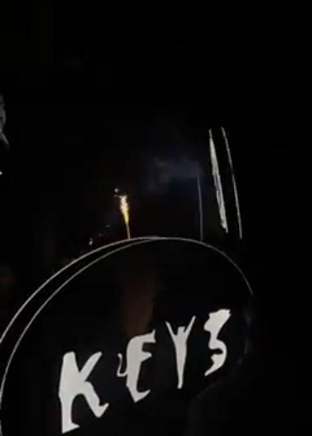 nighttime club scene with people holding sparklers in the air. A sign that says “KEYB” is visible. The lights come up on people standing against a striped wall with disco balls. The people are dancing and moving in time with the music.