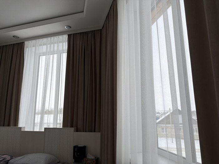 The scene is an interior room located in Ershov, Russia, looking out through two windows. The ceiling is white with a recessed multi-level design and two visible circular light fixtures. Both windows are dressed with pleated white sheer curtains and heavy brown opaque curtains. Through the sheer curtains, a snow-covered outdoor environment is visible, featuring low-rise residential structures with pitched roofs under an overcast sky. In the foreground, a white headboard or room divider with a textured surface extends across the lower portion of the frame. On a surface behind the headboard, a black electronic device and a multi-colored tissue box are present. A grey pillow is also partially visible on a bed behind the headboard on the left. No individuals are depicted, and no actions are in progress.