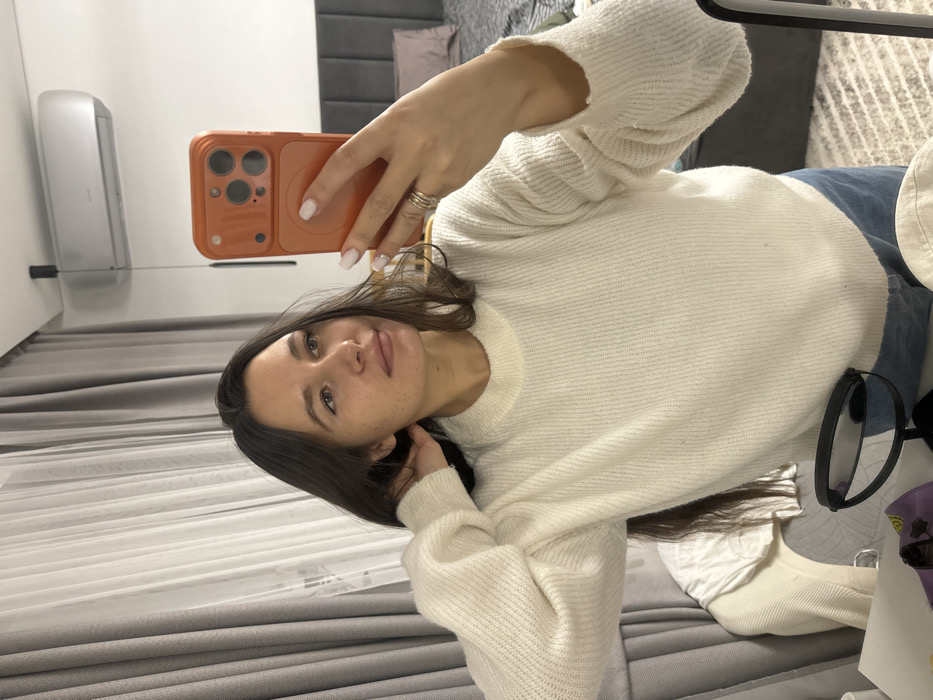 A female subject is depicted indoors, within a private residence in Грибовчанка Снт, Russia. The subject, possessing long dark hair and light skin, is shown from the chest up, reflected in a large mirror while capturing a selfie. She is wearing an off-white, ribbed crew-neck sweater with full sleeves and blue jeans. Her right hand, adorned with multiple rings on the ring finger and fingernails painted white, holds an orange-cased smartphone with a visible triple-lens camera array, directed towards the mirror. Her left hand is raised, with fingers positioned near her left ear, as if adjusting her hair. The subject's gaze is directed slightly to her right. The background, visible in the mirror's reflection, includes light grey and sheer white curtains on the left side. Towards the upper right, a white wall-mounted air conditioning unit is visible, with a dark pendant light fixture hanging below it. To the right, a bed is present with a dark grey upholstered headboard and a pink-colored pillow. A portion of a patterned rug or carpet is visible on the floor. In the immediate foreground, outside the mirror's reflection, a small black cosmetic mirror on a stand and various indistinct objects are positioned on a white surface.