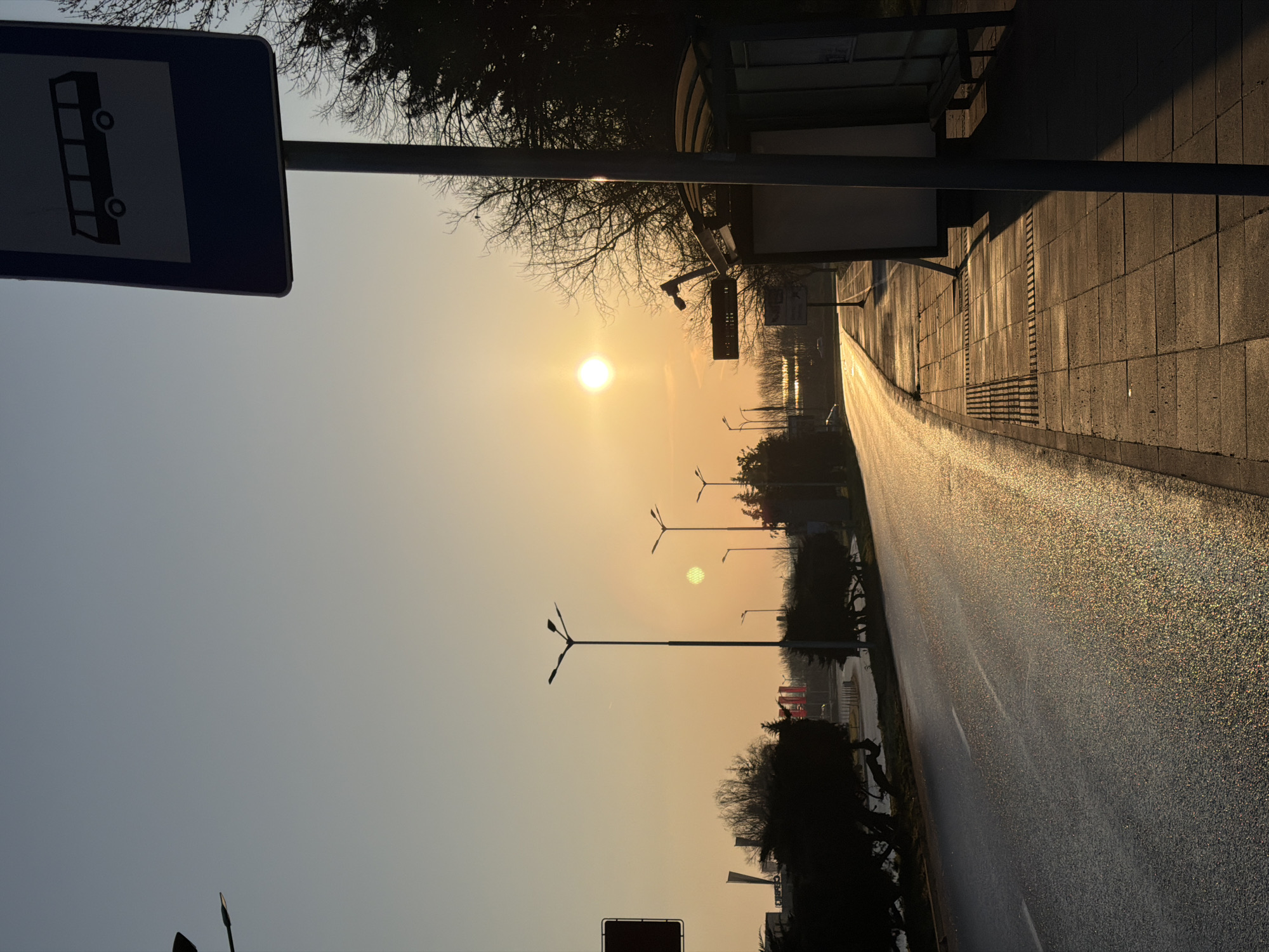 The image displays an urban street scene in Burgas, Bulgaria, during low sun conditions, indicative of either sunrise or sunset. The sky is clear, transitioning from light blue at the zenith to orange-yellow near the horizon, where the sun is a distinct, bright disk positioned slightly right of the image center. In the foreground on the right, a bus stop is present. A dark blue rectangular sign with a white bus pictogram is mounted on a metal pole, its shadow extending across the sidewalk. The bus shelter features a curved translucent roof and a visible wooden bench. The sidewalk is paved with square concrete tiles, incorporating metal drainage grates, with portions illuminated by direct sunlight contrasting with shadowed sections. An asphalt road occupies the left and central parts of the image, showing two white lane markings. The road surface reflects direct sunlight. Multiple streetlights with multi-arm fixtures are spaced along the left side of the road, casting long shadows. Further into the background on the left, dark silhouettes of trees and indistinct urban structures are visible, including red banner-like objects. No people or vehicles are present in the scene.