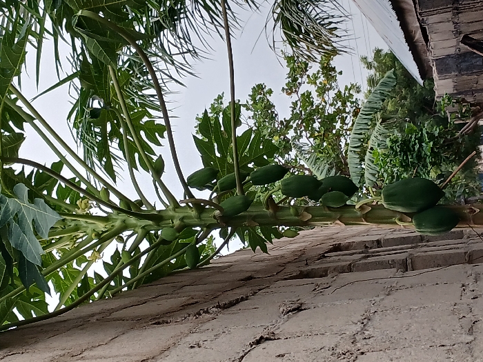 - "A vertical image captures a papaya tree laden with unripe green fruit and small, pale yellow flowers, situated against a weathered concrete block wall on the left" by FM-Oh2n63, licensed under CC BY 4.0