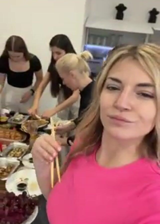 Several women are standing around a table laden with food, presumably enjoying a meal together. One woman, wearing a bright pink top, is holding chopsticks and filming a selfie video, first focusing on herself, then panning to show the spread of food and the other women. Later, she moves closer to another woman wearing a light blue sweatshirt, and they both make a kissing face towards the camera. The environment appears to be a brightly lit room, possibly a dining area or kitchen.