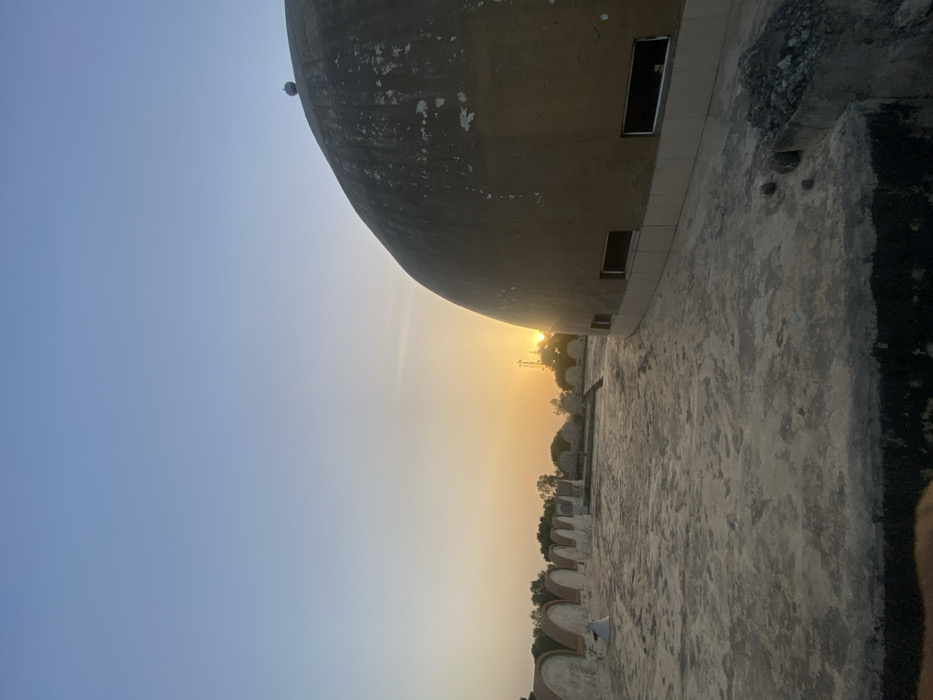 The image displays an exterior rooftop scene in Baganakwo, Nigeria, at either sunrise or sunset. The foreground and midground feature a flat, grey, weathered concrete rooftop with visible surface irregularities. On the left, a series of repeating, light-colored parapet structures with curved, terracotta-toned tops extends along the rooftop edge, behind which a white vent is visible. To the right, a large, weathered, light-brown dome structure rises prominently, featuring multiple rectangular window openings set within a lighter tiled strip near its base. A small, spherical metallic finial is positioned at the dome's zenith. The sun, a bright yellow-orange disc, is low on the horizon in the left-midground, partially obscured by distant green foliage and a slender utility pole. A small pile of construction debris, consisting of gravel and concrete fragments, is visible on the rooftop edge in the lower right corner. No individuals are present, and no actions or interactions are depicted.