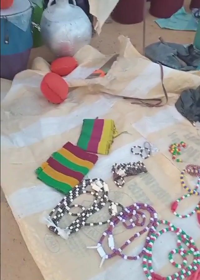 A still, medium shot reveals a collection of items laid out on a striped tarp on the ground. The objects include several beaded necklaces of varying colors and patterns, two small red objects, a silver-colored vase, a striped cloth, a knife, and various plastic bags. Red buckets or containers are visible in the background. The ground appears to be sand or dirt. The overall impression is that the items are being displayed for sale or trade at an outdoor market or similar event.
