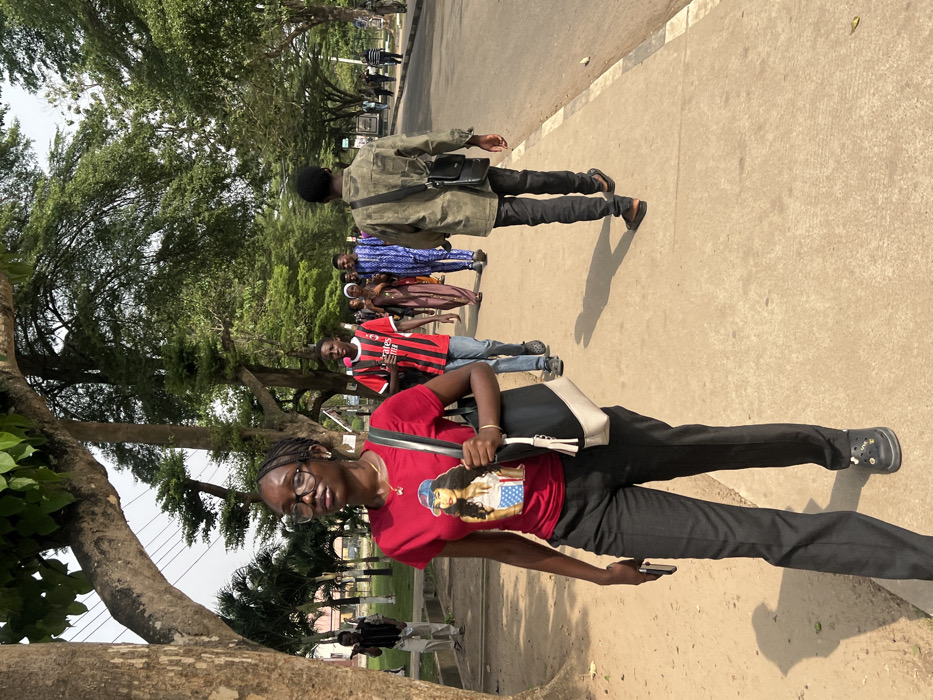 This image captures a daytime scene on a pedestrian walkway in the city of Ijanikin, Nigeria. The bright, direct sunlight creates distinct shadows on the concrete pavement. In the immediate foreground, a dark-skinned female, approximately 20-30 years old, with dark hair styled in braids or dreadlocks and clear-framed eyeglasses, walks towards the left, directly engaging the camera with her gaze. She is attired in a red short-sleeved t-shirt featuring a graphic print of a woman in an American flag-themed top, dark grey trousers, and dark-colored Crocs adorned with several small, colorful charms. A black and light-colored shoulder bag hangs from her left shoulder, and she holds a light-colored smartphone in her right hand. In the midground, several individuals are walking away from the camera on the same pedestrian path. The most prominent is a dark-skinned male viewed from the back, wearing an olive-green long-sleeved shirt or jacket, dark trousers, and dark open-toed sandals, with a small dark bag slung across his body. To his left, another dark-skinned male wears a red and black striped AC Milan football jersey, blue jeans, and dark footwear. Further behind them, a small group of people, dressed in a mix of casual attire and traditional Nigerian garments (including a blue patterned men's outfit and a patterned long dress), continue walking in the same direction. The environment consists of a concrete pedestrian walkway running parallel to an asphalt road visible on the right. Both sides of the path are lined with numerous mature trees featuring abundant green foliage, casting varying degrees of shade. Overhead utility lines are visible through the trees in the upper left portion of the frame. In the far background on the left, a light-colored building is partially discernible.